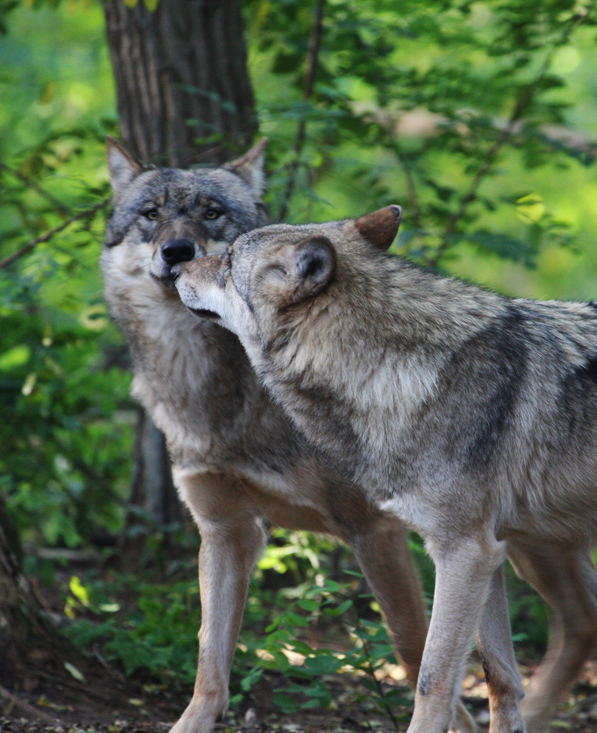 Wölfe sind sehr intelligente und kooperative Tiere, so helfen beispielsweise die Jährlinge bei der Aufzucht der jüngeren Geschwister. Für den Zusammenhalt und die Kommunikation spielen Geruchssignale, Haltungen und Bewegungen des Kopfes, der Ohren, des Körpers oder der Rute als auch Lautäußerungen eine wichtige Rolle. Sie lassen zum Beispiel erkennen, ob ein Tier drohen oder beschwichtigen will. Duftmarken und das über viele Kilometer hörbare Heulen nutzen Wölfe um ihr Territorium abzustecken. Sie signalisieren damit fremden Wölfen: Dieses Gebiet ist schon besetzt! Die Größe der Rudel richtet sich nach Qualität des Lebensraums, der Dichte der Beutetierpopulation sowie der Gesundheit der Wölfe. In Deutschland geht man von durchschnittlich acht Tieren pro Rudel aus, die Welpen mitgerechnet.
